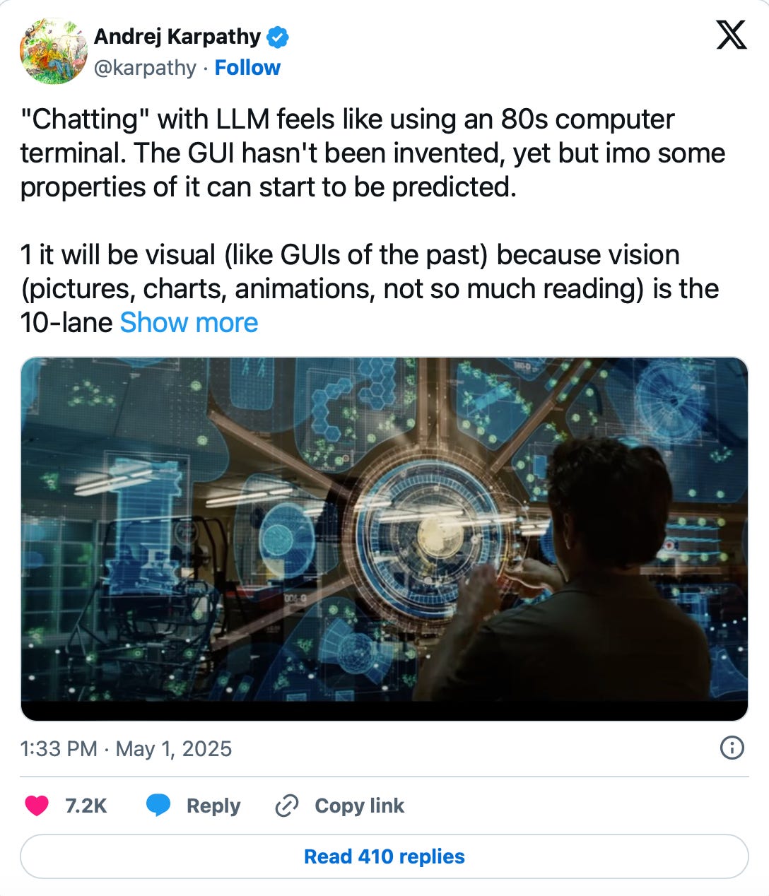 Andrej Karpathy put it sharply: chatting with LLMs today feels like using an 80s terminal before the GUI was invented. Text is the command line, the “desktop” hasn’t arrived yet. What’s coming will be visual, generative, and adaptive — interfaces created on demand, shaped to your context, and dissolved once their purpose is served.